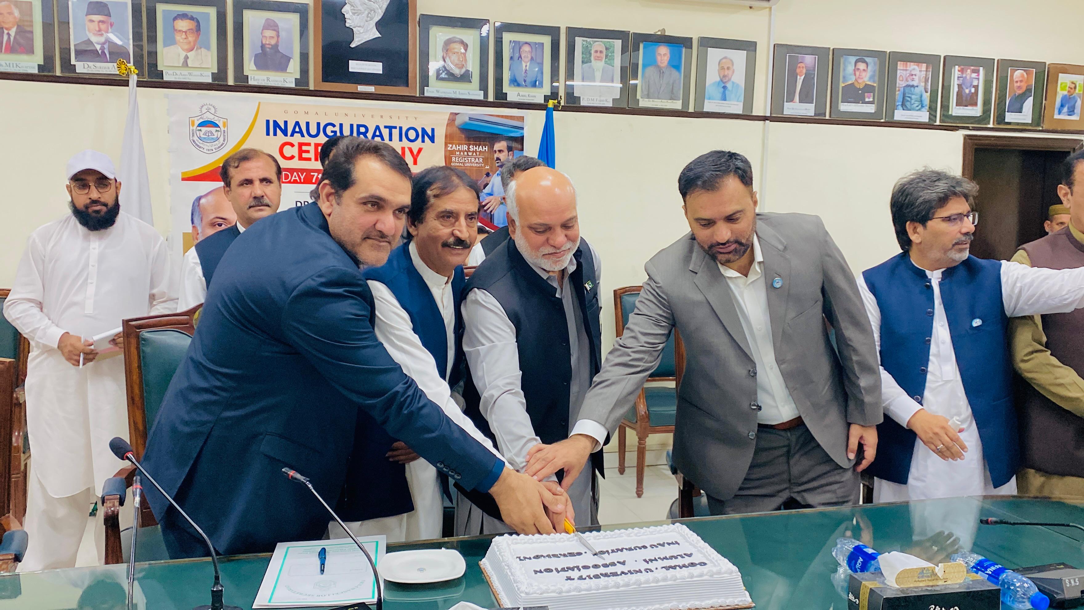 Gomal University VC Dr. Zafar Iqbal, Professor Dr. Shakeeb Ullah, Professor Dr. Khair Uz Zaman & Brigadier Abdul Rahim are cutting the inauguration cake of Alumni in Gomal University.