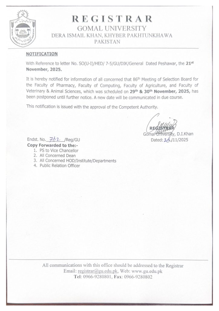 وائس چانسلر گومل یونیورسٹی پروفیسر ڈاکٹر شکیب اللہ کی ہدایات پر ڈائریکٹر ایڈمیشن کے زیر انتظام گومل یونیورسٹی کے یونیورسٹی