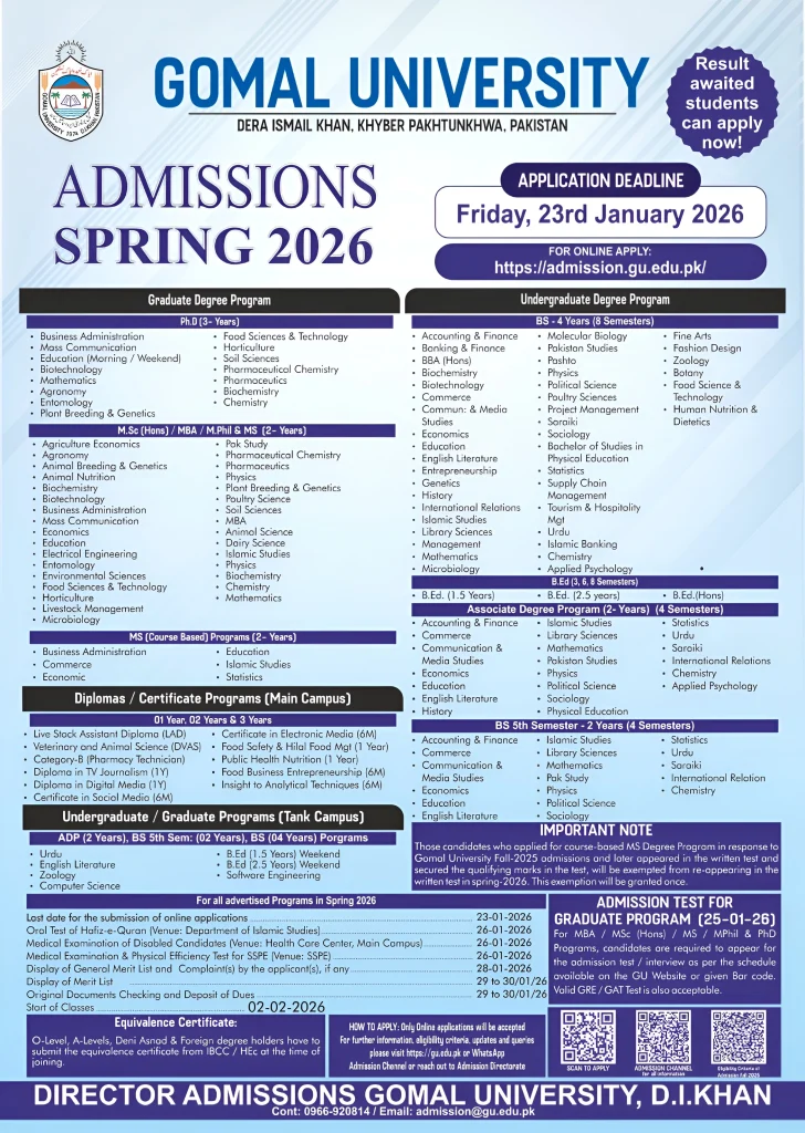 پہلے داخلے کی آخری تاریخ 16 جنوری 2026 مقرر تھی، تاہم خواہشمند امیدواروں کی سہولت اور داخلہ امور کو مؤثر انداز سے مکمل کرنے کے پیشِ نظر اب یہ تاریخ بڑھا کر 23 جنوری 2026 کر دی گئی ہے۔