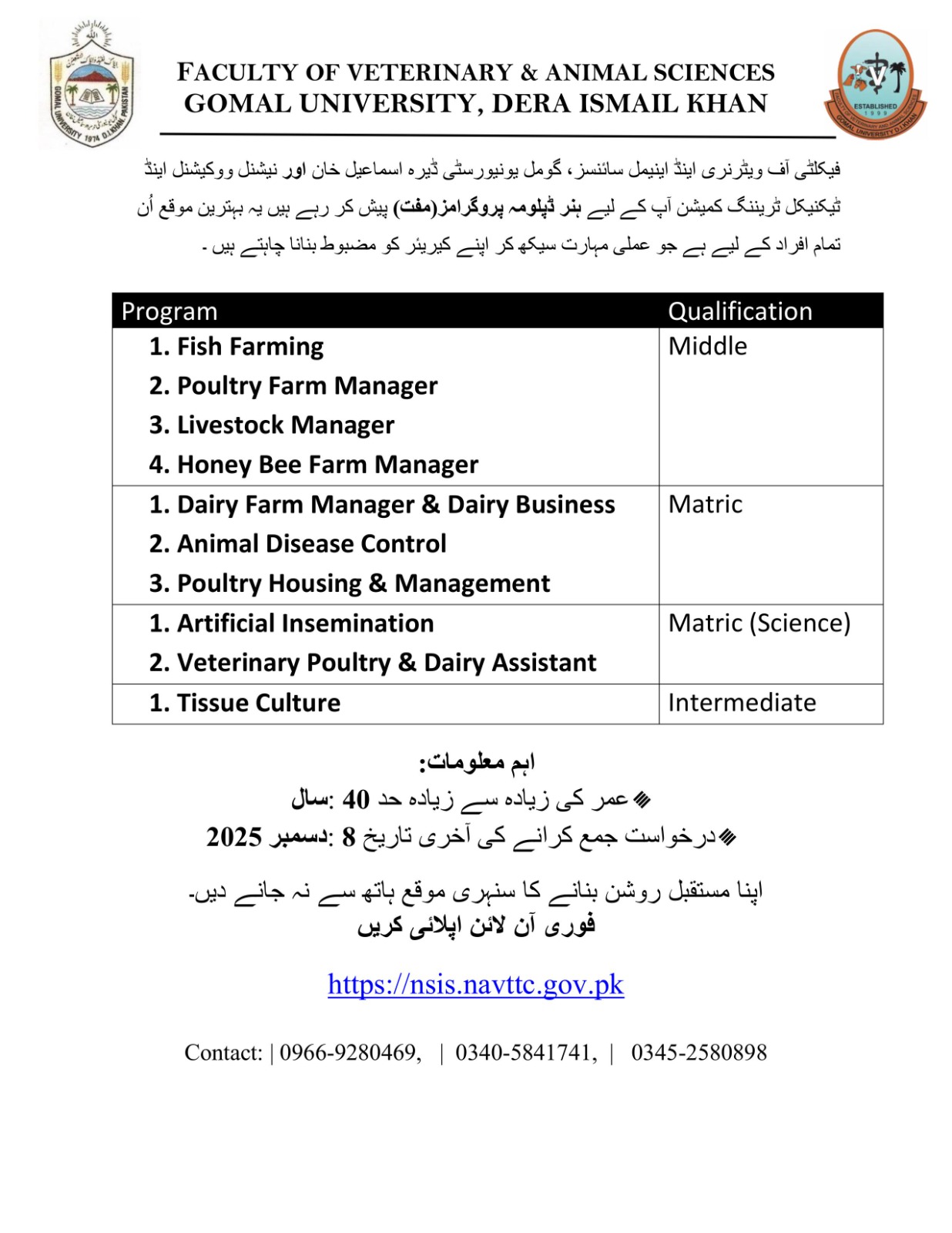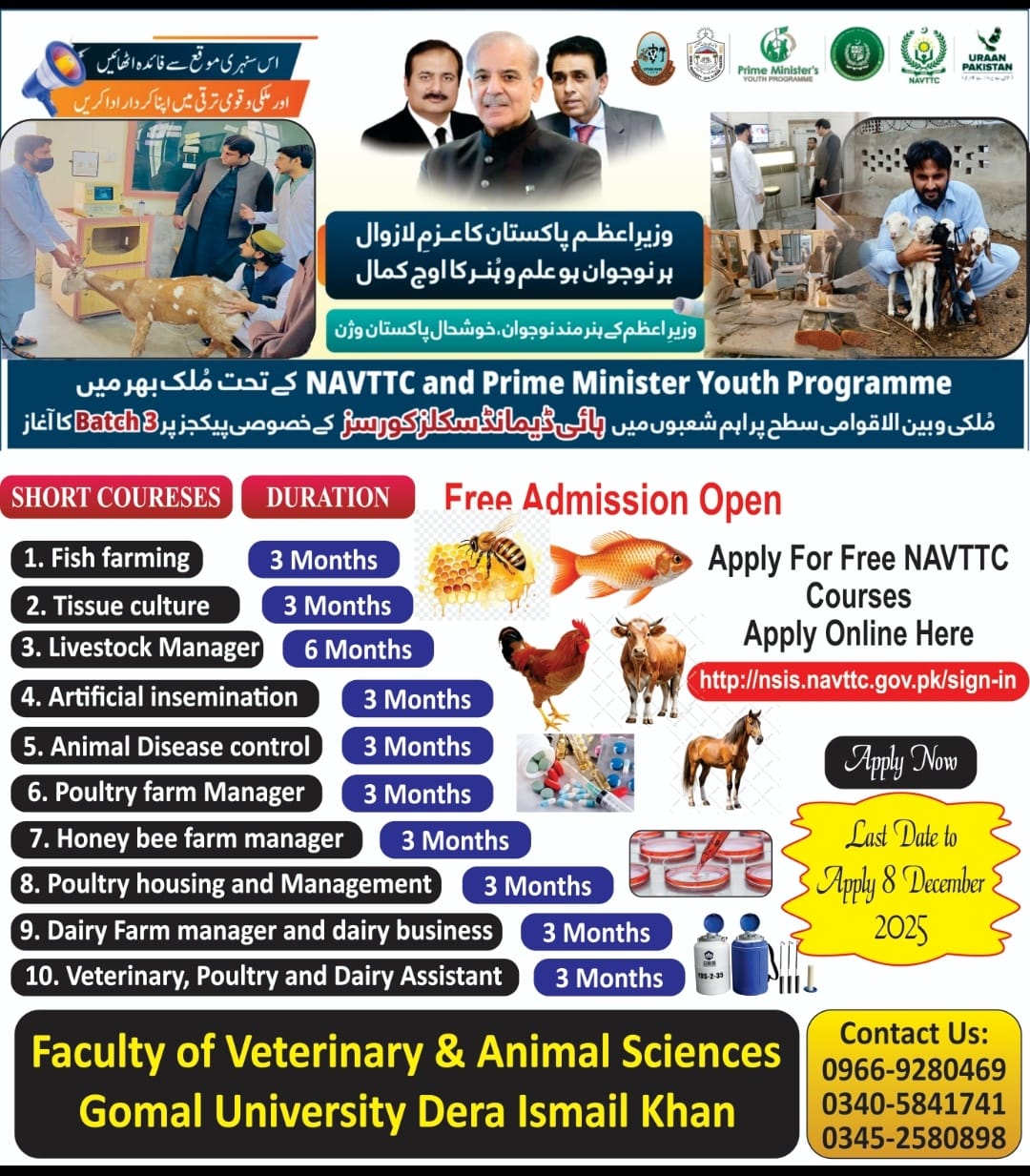 NAVTTC Certified Free Veterinary & Animal Sciences Courses at Gomal UniversityBy Admin / 6 December 2025 Last Date to apply: 8th December 2025 To apply visit: https://nsis.navttc.gov.pk