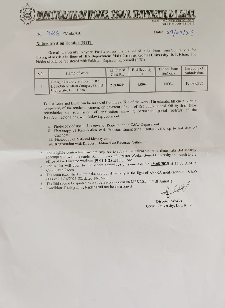Notice Inviting TenderBy Admin / 30 July 2025 Gomal University Khyber Pakhtunkhwa invites sealed bids from firm/contractors Click Here to download Tender Notice