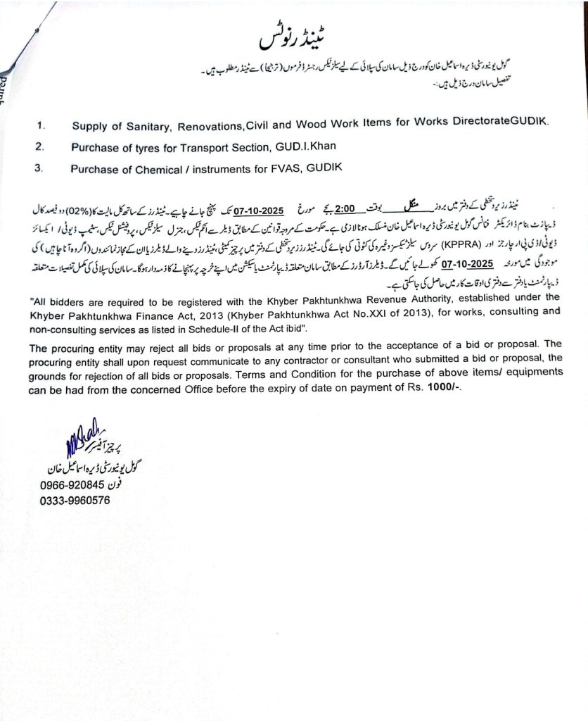 Gomal University D.I. Khan invites sealed tenders for the supply of sanitary items, renovation & civil works, tyres, and chemicals/instruments. Interested suppliers can submit their bids by 07 October 2025, 2:00 PM. Tender documents can be obtained from the Director Works Office on payment of Rs. 1000/-.