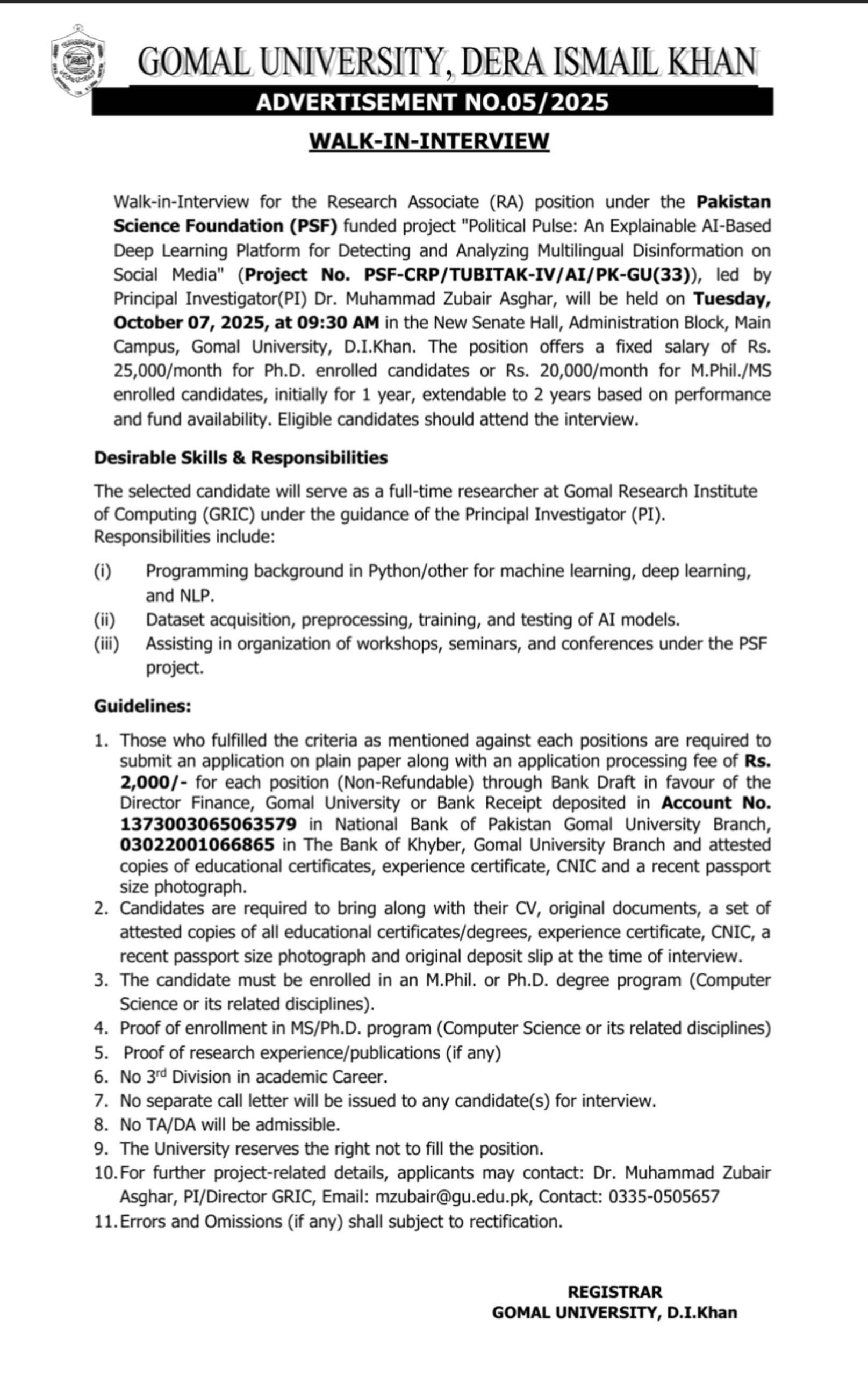 Gomal University Walk-in Interview – Research Associate (RA) Position (Advertisement No. 05/2025)By Admin / 24 September 2025 Download Advertisement